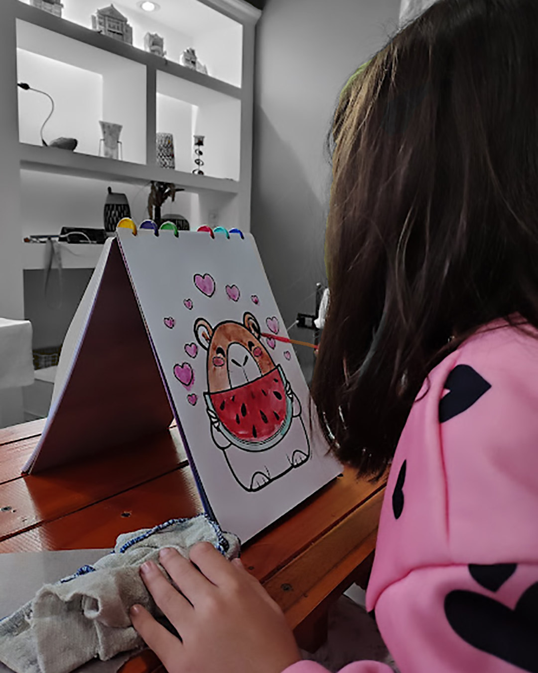 Es un libro para colorear que se convierte en un atril para pintar con acuarelas